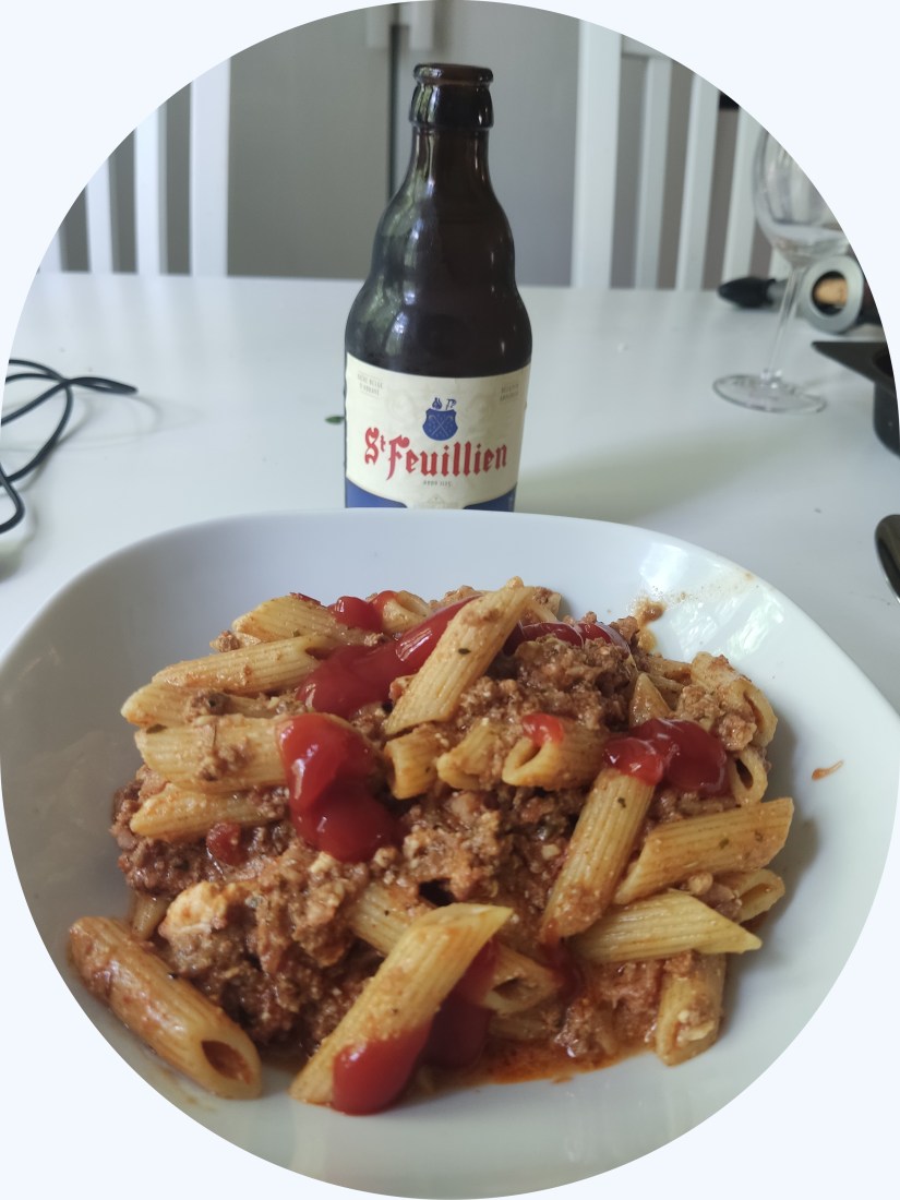 Det blev en Pastagryta med mycket smak,och i glaset en öl från Belgien St Feuillien,en riktigt ljus rackare,men det var drag i den 8,5 %..Men gårdagens mörka från Skottland leder skyhögt än så länge..