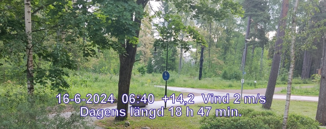 +14° C Vind 2 m/s Mest klart och uppehåll Känns som+14° Lufttryck 1009 hPa Daggpunkt+13° Fuktigh 94 % Sikt 9999 m Soluppgång 03:26 Solnedgång 22:14 Dagens längd 18 h 47 min.