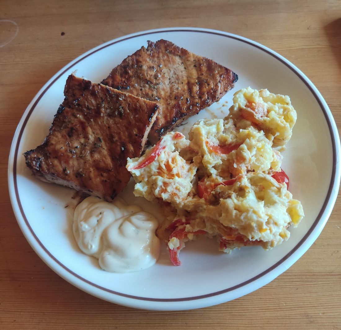 Det är ingen överdrift.Det blev grillad Trocaderomarinerad flädkytterfil’e smashade potatis morötter palsternacka paprika creme fraiche bea.en riktigt höjdare.I glaset en gammal röd från Italien Ripresa från 2012,, funkade klockrent