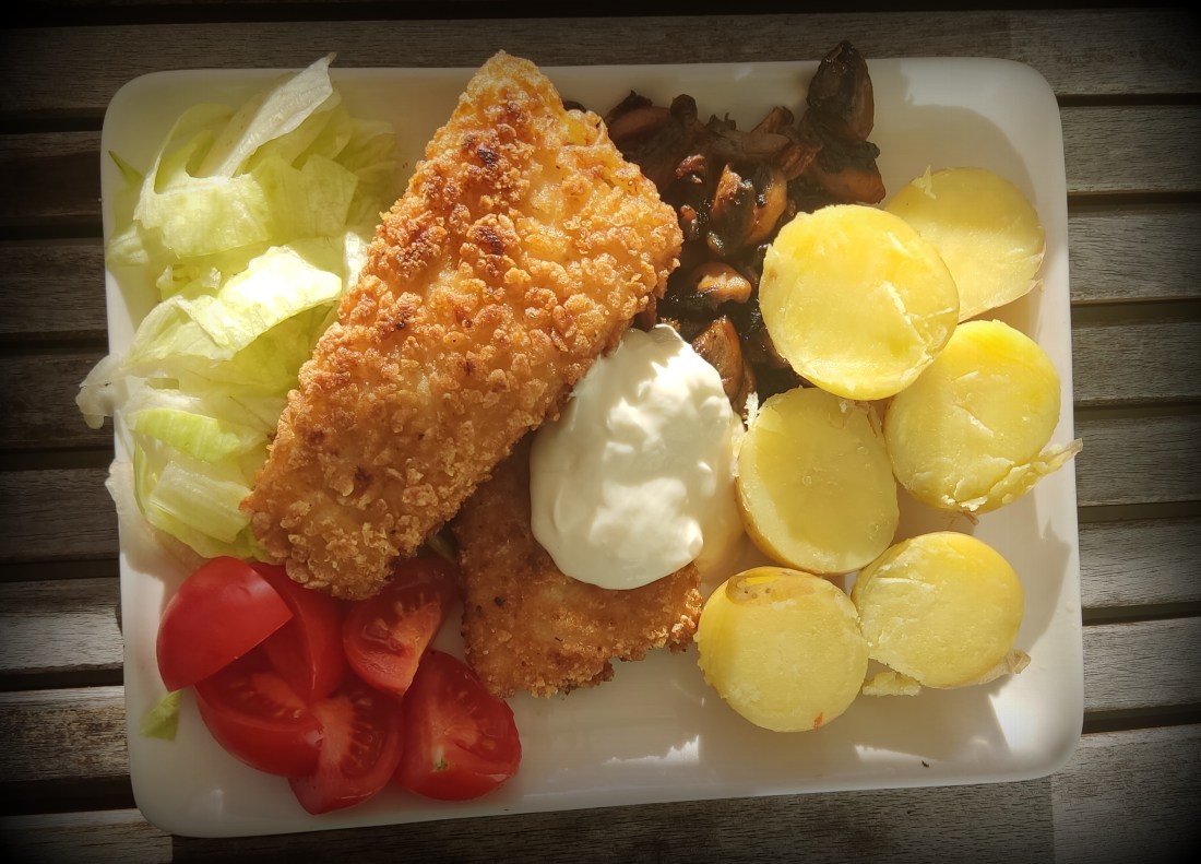 Kanske om jag får lite mat i kaggen att det ska ramla ned några passande bokstäver..På tallriken även idag panerad torsk,potatis och lite grönt,gillar också stekta champinjoner,creme fraice fick göra rätten komplett..Gott.