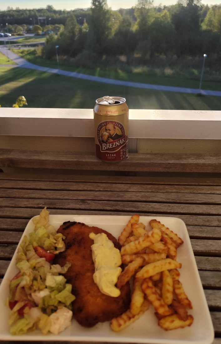 När det blev matdax idag så lockade balkongen,på tallriken blev det en snitzel med pommes och lite grönt(sallad med fetaost).Smakade bra,i glaset en Tjeckisk öl,Breznak
