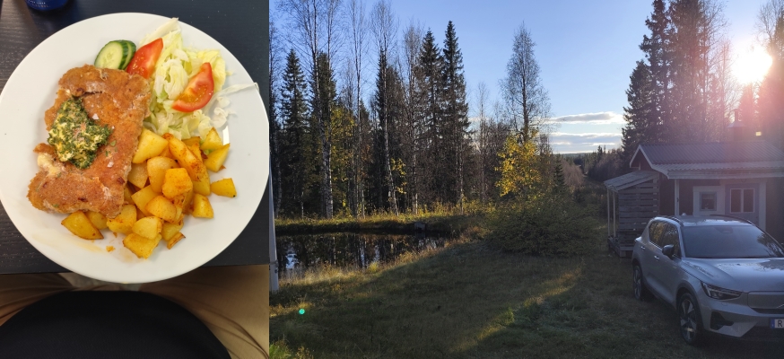 Startade från Skutskär fredag morgon blev upplockad av sonen 08:10..Det blev som vanligt;Västerbottensnitzel på Ankis i Dorotea.Kom till stugan 15.45. Plockade in våra förnödenheter och därefter den sedvanliga rutinen Välkommen till Lappland..