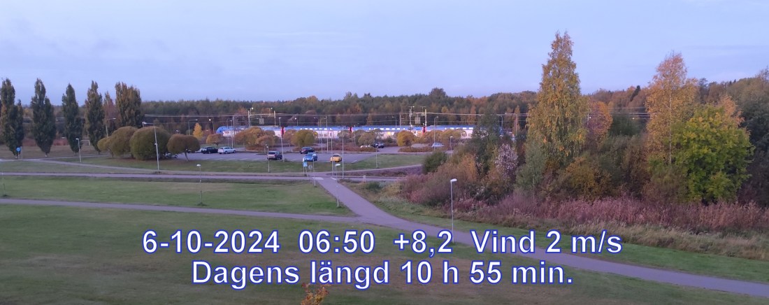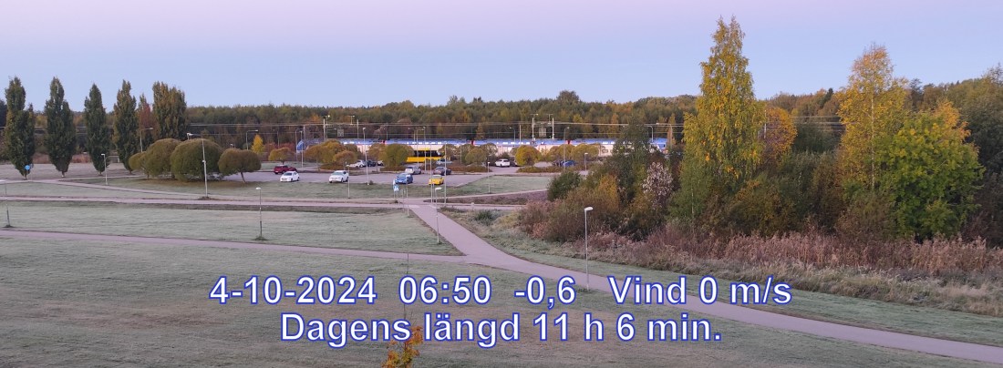 0° C Vind 0 m/s Klart och uppehållsväder Lufttryck 1021 hPa Fuktigh 99 % Sikt 13880 m Soluppgång 06:59 Solnedgång 18:17 Dagens längd 11 h 17 min.