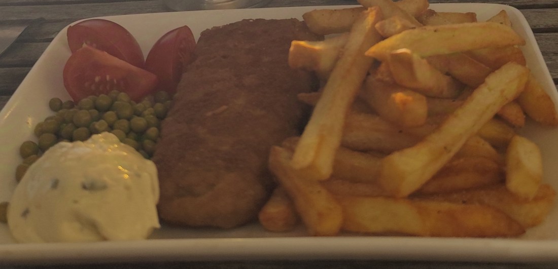 Det har varit en strålande dag,när det blev matdags så såg jag på termometern att graderna därute började dala,så jag bestämde raskt att jag ska uteäta idag.På tallriken blev det min tolkning av Fish and Chips,med Panerad Torsk, Pommes, Remouladsås,gröna ärtor och lite tomat..I glaset ett Tyskt Oktoberöl Paulaner som sonen lämnade förra helgen..Graderna på balkongen +18 sköna,riktigt mysigt faktiskt. Men jädrar så fort graderna dalade,när jag käkat färdigt var det bara +12…