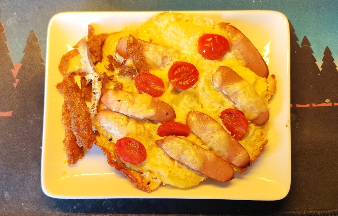 Lunchen idag blev en hittepå rätt.Skivade lite kokt potatis i botten på stekpannan,slog över 2 vispade ägg,halverade några prinskorvar,lite riven ost och minitomat,salt och svartpeppar..stekte sedan på medium värme under lock i ca 7 min..Blev inte så tokigt..