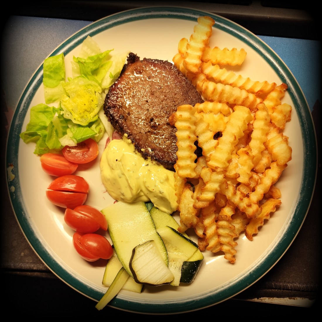 Dagens tallrik blev en favo i repris.Pepparbiff med tillbehör.Pommes,sallad, tomat och picklad succini,fick plats med lite bea också,smakade riktigt bra..