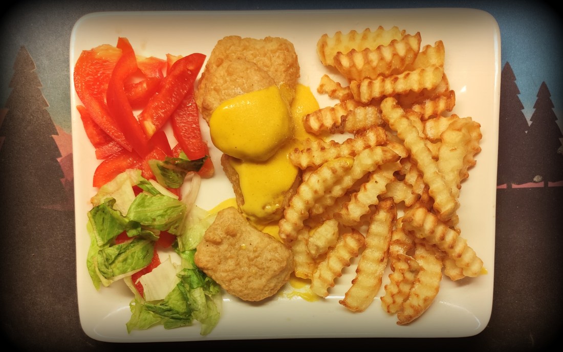 Ja så sant som det är sagt..Chicken Nuggets med pommes,lite grönt och Mango/Pesikasås..Det jag hade i glaset kom från vattenverket,smakade utmärkt..Om jag inte är ute och cyklar så var det första gången jag köpt Chicken Nuggets,men inte den sista,smakade ju riktigt bra.I frysen till ett mål till.