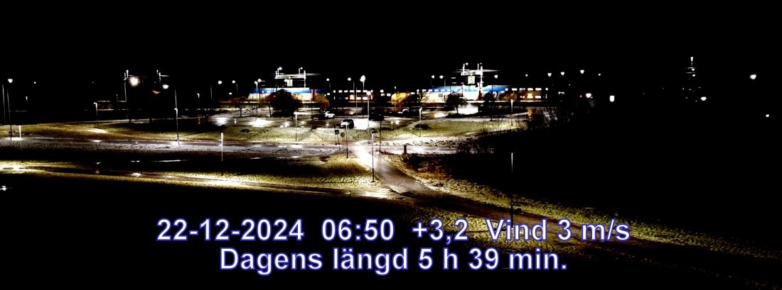 +3° C Vind 3 m/sMulet, men troligen uppehåll Känns som-1° Lufttryck 979 hPa Daggpunkt+2° Fuktigh 97 % Sikt 43550 m Soluppgång 08:59 Solnedgång 14:39 Dagens längd 5 h 39 min.