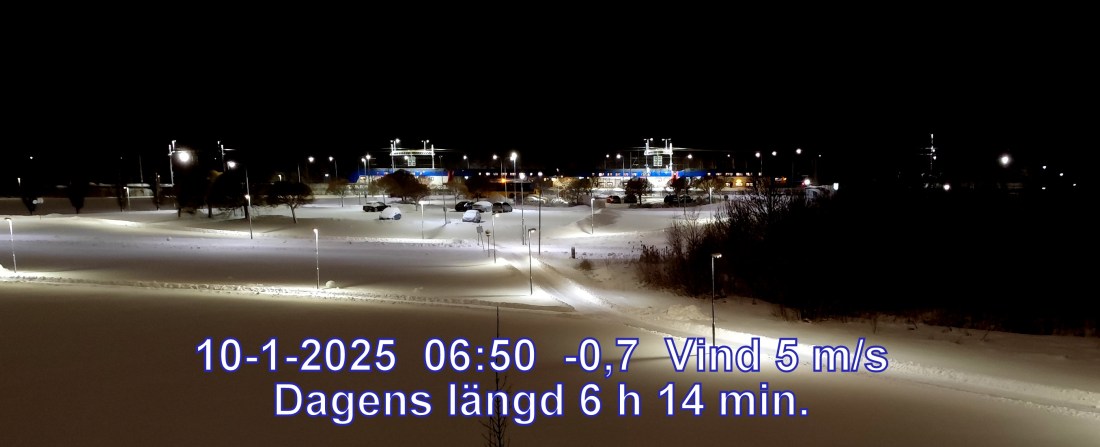-1° C Vind 5 m/s Mulet och något snö Känns som-7° Lufttryck 1008 hPa Daggpunkt-2° Fuktigh 93 % Sikt 2200 m Soluppgång 08:51 Solnedgång 15:05 Dagens längd 6 h 14 min.