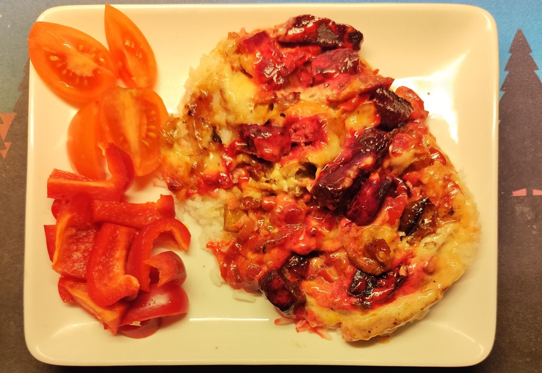 Jo det blev ”Farfars Hitta på” eller kanske ta reda på slattar..Hur som helst så blev det riktigt gott.Vi tar det från början.Jag skar en medelstor potatis i små tärningar,ner i stekpannan,efter en stund lite bacon som fick gå med,skar ned en röd paprika i tärningar,en gul skuren lök fick göra paprikan sällskap så även lite rödbeta skuren i stavar.Saltade lite lätt,lite svartpeppar också.Blandade allt i en form.Slog över 3 dl matgrädde och toppade med riven gratängost.In i ugnen 200* i ca 20 min.Kokade lite ris..Blev väl inte världens snyggaste tallrik,En tomat fick bli tillbehör.
