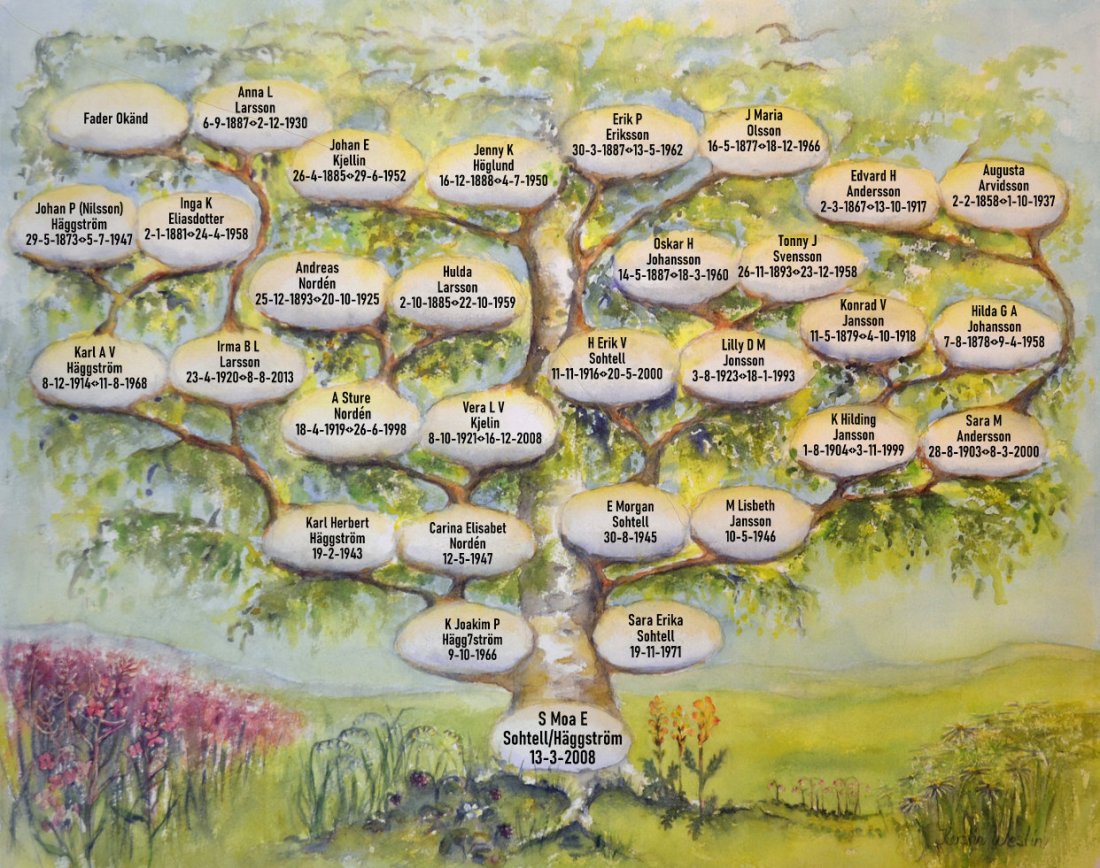 Nej jag har inte blivit skogsägare på riktigt,,men jag har många träd..Jag ska förklara detta uttryck.Som de flesta av er redan känne till så har jag sysslat med ”Släktforskning” nu i mer än 50 år,inte bara på mina egna anor,utan även hjälpt några av mina vänner..Men tillbaka till träden,snart har nog mina nära och kära fått se sina ”Släktträd”..Och så här ser dom ut..Detta startar med barnbarnet Moa född 2008..Kanske jag ska fixa ett åt mig själv också..