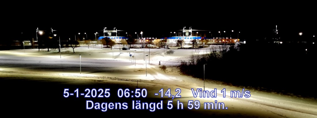 -9° C Vind 2 m/sMulet, men troligen uppehåll Känns som-14° Lufttryck 1001 hPa Daggpunkt-13° Fuktigh 74 % Sikt 50000 m Soluppgång 08:57 Solnedgång 14:54 Dagens längd 5 h 56 min.