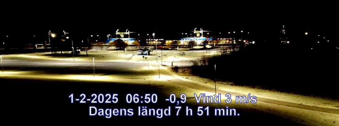 -1° C Vind 3 m/s Klart och uppehåll, Känns som-6° Lufttryck 1024 hPa Daggpunkt-3° Fuktigh 84 % Sikt 50000 m Soluppgång 08:08 Solnedgång 16:00 Dagens längd 7 h 51 min.
