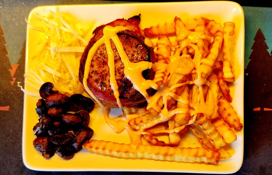Ja sedan var det ju dags att få något matnyttigt i kroppen.Hade tagit fram en bit Fläskytterfilé,funderade ett tag på vad ska jag göra med den..Jo det ska bli en variant som jag gjort tidigare..Skar en ca 5 cm bit som jag brynte på runt om,lindade sedan bacon runt om,in i ugnen 180* till en 65 grader innertemp.Stekte lite champinjoner och laddade airfryern med pommes.Det blev Fläskytter Tounedos med kinakål,champinjoner,pommes,hot kebabsås.I glaset samma vin som jag hade igår,den röda från Spanien.Riktigt gott..