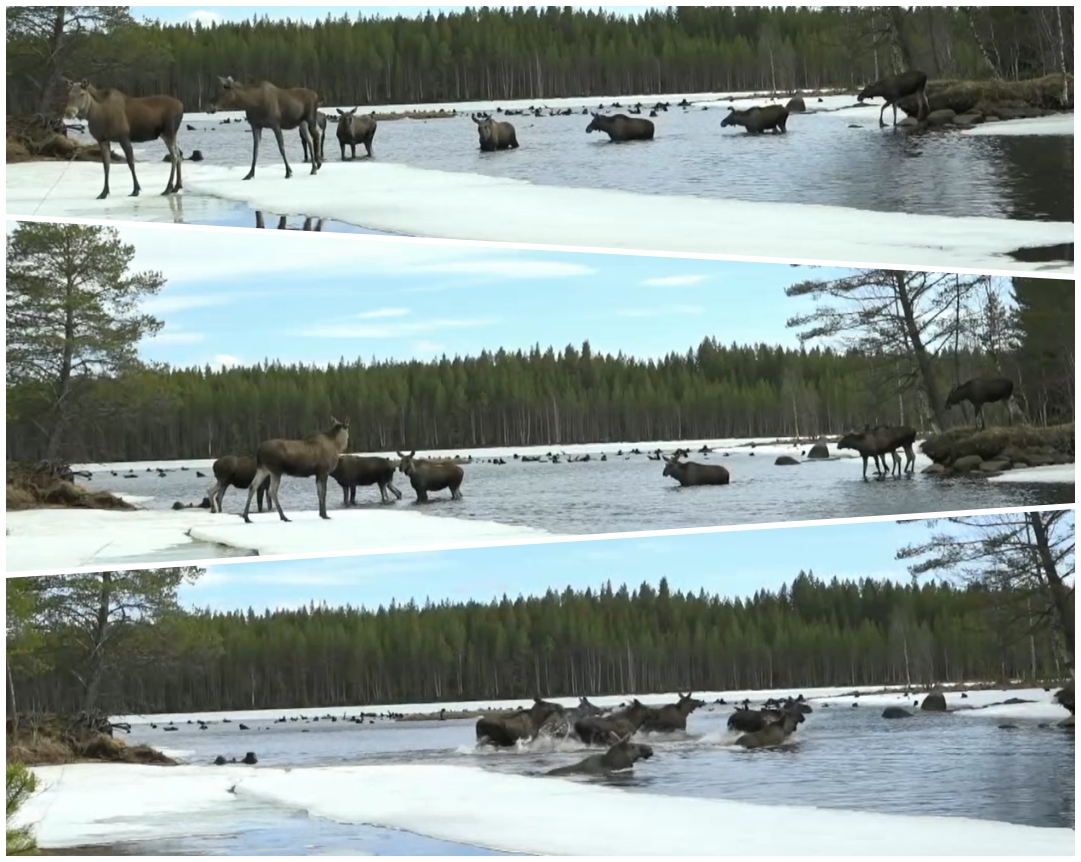 Det samlades 8 älgar vid Passagen,alla vadade över,men stannade upp på iskanten.Plötsligt hände något som jag inte hade anat,alla älgarna tvärvände och skyndade tillbaka till varifrån dom kom..