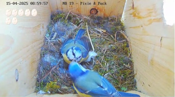 Läser i kommentarerna att det är Puck som ger Pixie lite ätbart,läser även att Pixie lagt ett till ägg några minuter efter kl 09 idag,nu finns 8 ägg i boet..
