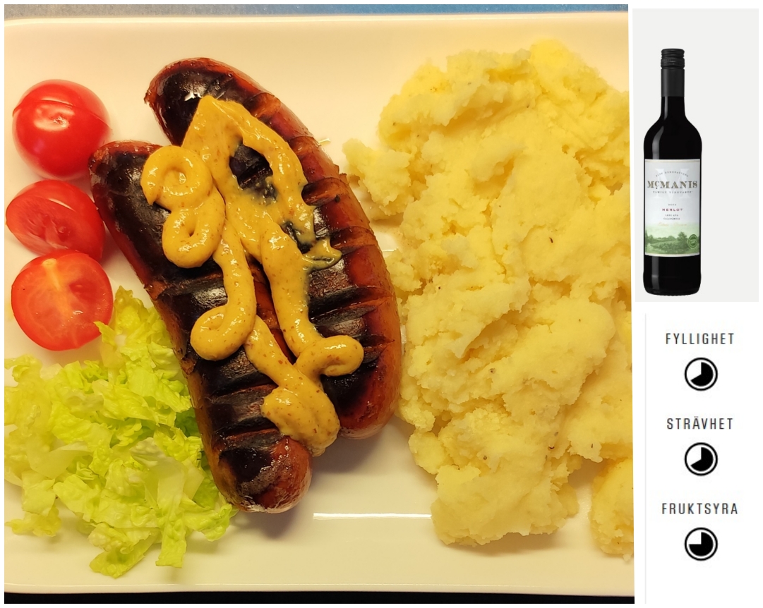 Något annat kan jag inte säga,pulvermos salt&svartpeppar,2 st Choritzokorvar,med drag i,lite grönt och Johnnys senap..I glaset en riktigt god röd från USA Kalifornien Lodi McManisMerlot, 2022 99:- Nr 20070.