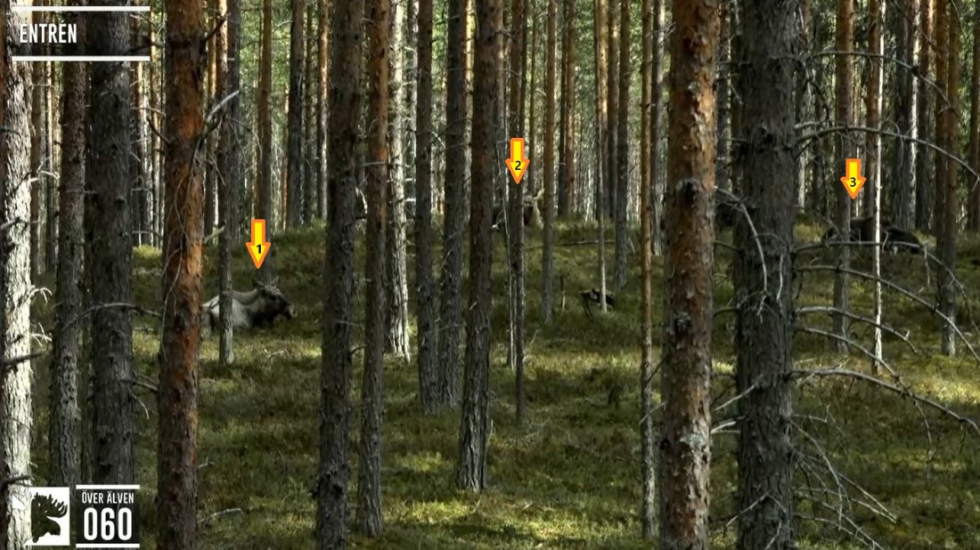 Ser att de tre älgarna Ko +2 kalvar fortfarande kl 16:30 är kvar i Entren,dom kanske tar en liten stödvila innan simturen över älven.