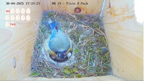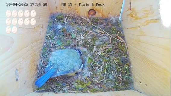 Jag ser att Pixie nu bökar och rullar äggen väldigt ofta.Puck kommer lite oftare nu med lite mat i näbben..