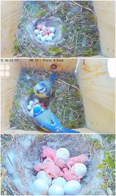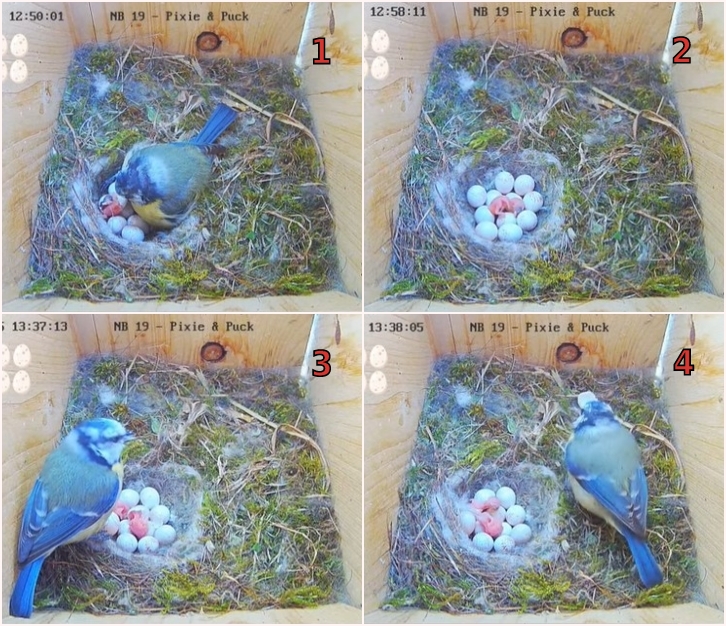 Nu har nya Blåmesungar kommit.Bild 1 den första ungen kryper precis ur sitt ägg,kl 12:50..Bild 2 Pixie har lämnat holken en kort stund,kanske för att tala om för Puck att han nyss blivit pappa.Bild 3 kl 13:37 kläcks ägg nr 2..Bild 4 så ser jag att Pixie äter upp skalet..