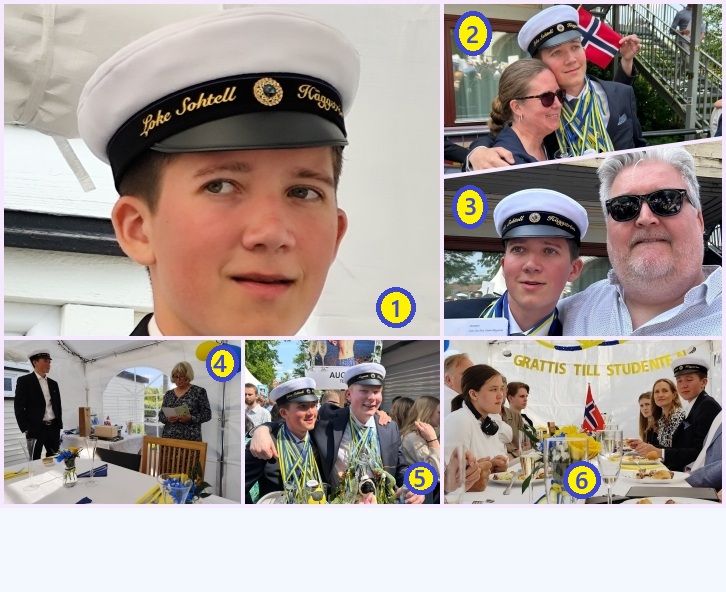 Dagens Huvudperson Loke Sohtell Häggström..2. En Mammakram framför den Norska flaggan Loke föddes i Norge i 18 Mars..3. Även pappa Joakim får en ”Kläm”..4. En stolt Mormor säger några ord till Studenten..