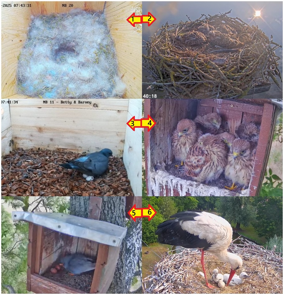 Här kommer ett Collage från min fågelkoll i morse..1).Undrar om Wendy gett upp försöket att bilda familj…2).De 4 Gjuseungarna i England vilar,kanske i väntan på frukost,som föräldrarna snart kommer med…3).Duvan Betty som nu ruvar på sin 2:a kull har rullat de 2 äggen…4).Tornfalkens 6 ungar börjar få det lite trångt i boholken…5).Pappa Aftonfalk som nyss har bytt av mamma falk,kollar att de 3 äggen är okey…6).Mamma Stork Zsófi kanske undrar vad som kommer att ske med ägget som fortfarande ligger kvar i boet,ungarna är nu 11 och 9 dagar gamla.Troligen blir det inget av ägg nr 3..