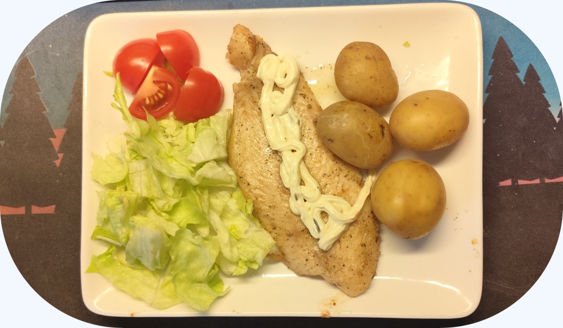 Idag blev det asiatiskt på tallriken ”Hajmal” tror det är en odlad fisk som kommer ifrån Vietnam,inte 100 säker dock..Kryddade med salt lite svartpeppar och citronpeppar.Kokt potatis remuladsås och lite grönt,smakade bra,i glaset Vitt från vattenverket,smakade också bra..