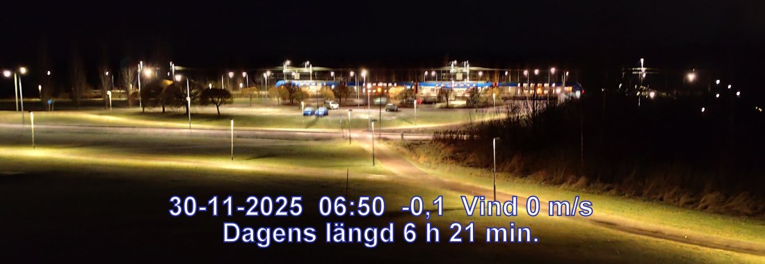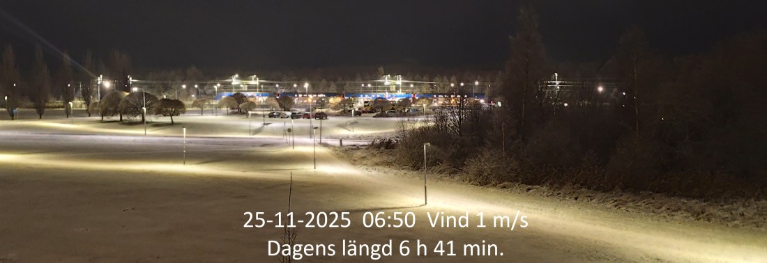 -6° C Vind 0 m/s Klart och uppehållsväder Känns som-6° Lufttryck 1017 hPa Daggpunkt-7° Fuktigh 91 % Sikt50000 m Soluppgång 08:18 Solnedgång 14:55 Dagens längd 6 h 37 min.