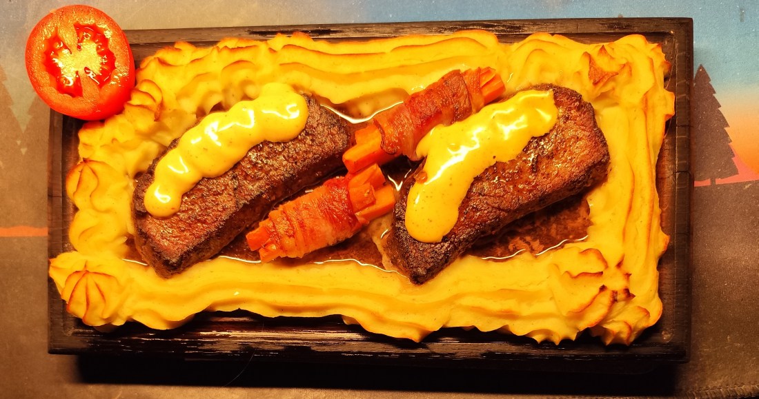När det blev dags för mat,så fixade jag till en planka med Pepparbiff,mos, baconlindad morot,kebabsås,,i glaset en god röd från Australien..