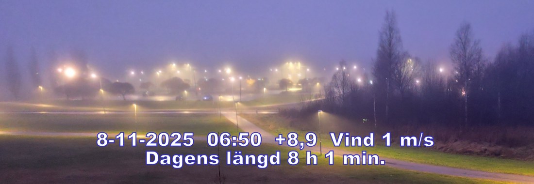 +8° C Vind 1 m/s Mulet, men troligen uppehåll Känns som+7° Lufttryck 1013 hPa Daggpunkt+7° Fuktigh 99 % Sikt 1341 m Soluppgång 07:32 Solnedgång 15:34 Dagens längd 8 h 1 min.