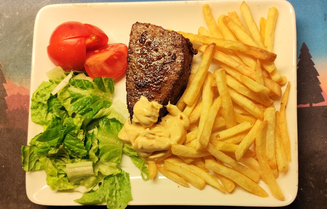 Hade en bit Pepparstek kvar sedan före julen,den fick det bli idag.Pommesstrips Bea och lite grönt.Detta var vad skåpet kunde bjuda på,efter julfirande med familjen i Uppsala.Vattenverket levererade drycken.Tog ett glas Blossaglögg som avslutning,vilket gillades av mina smaklökar..