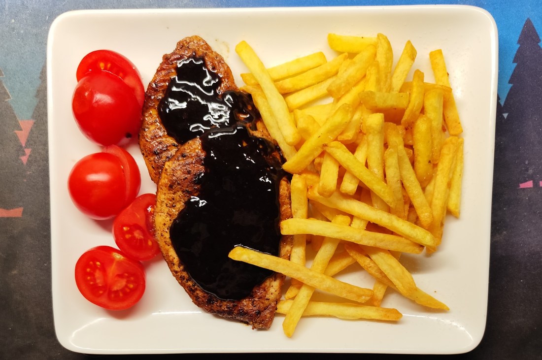 Det blev benfri kotlett pommes strip och en mustig sås på stekskyn och ,”fond du Chef” från Knorr,,,det gröna blev rött små tomater,smakade bra..