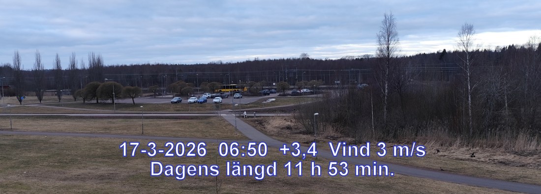 +3° C Vind 3 m/s Molnigt, men troligen uppehåll Känns som-1° Lufttryck 1015 hPa Fuktigh 89 % Sikt 19318 m Soluppgång 06:02 Solnedgång 17:56 Dagens längd 11 h 53 min.