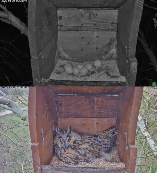 Utökning av fågelkollen,ny blir en Hornuggla som jag hittat i Ungern.Här kan det bli en stor familj..Normalt så brukar det bli 4-5 ägg i kullen,,men denna har lagt hela 7 ägg,ägg 1–15/3,2–17/3,3–19/3,4–22/3,5–24/3,6–26/3,7-28/3. Ruvningen som pågår ca 4 veckor den sköter honan om.Hanen ser till att mat finns under tiden ruvningen pågår..Kommer att följa denna familj..