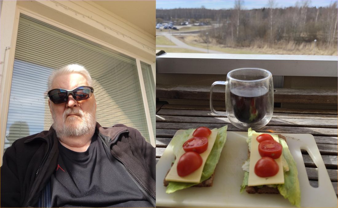 Strålande sol termometern visade +19,3 och jag var fikasugen..Fixade en kopp kaffe och 2 knäckemackor,tänkte ta en liten sol-mys-stund på balkongen…Men rackarns inte var det skönt,en vind som måste komma från Ishavet.Blev inte många minuter,trots att jag hade en flisjacka på.