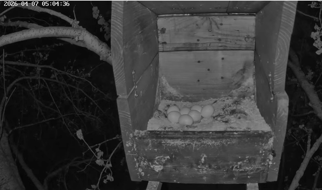 Kollade läget hos Hornugglan i Ungern straxt efter kl 05 i morse mamma Uggla har lämnat de 7 äggen,kanske för en bensträckare.