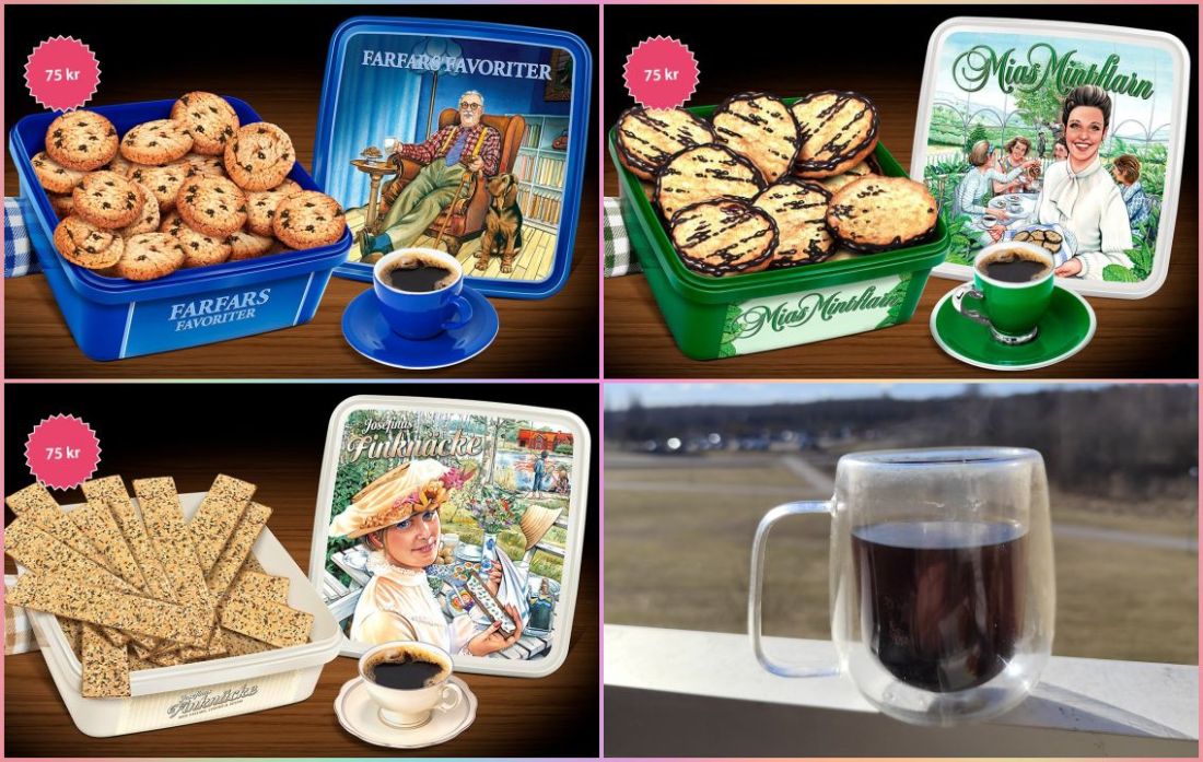 Nu är dimman uppäten av solen,glädjande,tar en fika och något gott till.Jacka och keps på,det var kallare än vad jag trodde solen har inte nått balkongen ännu.+4,8 så det blev en snabbfika,med Farfars Favoriter och Mias Mintflarn, som jag köpt av Moa till glädje för Klasskassan.
