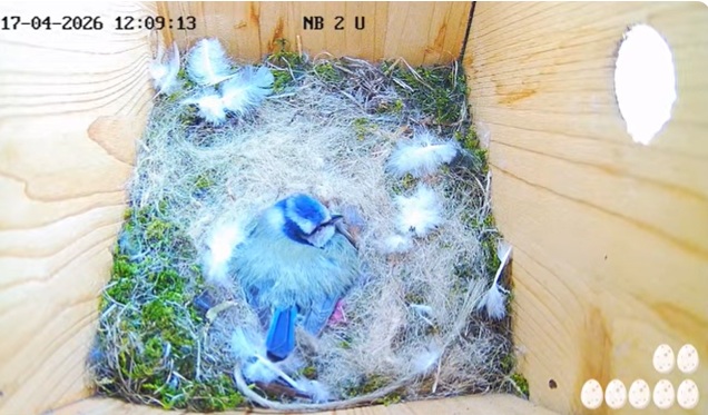 Har nu kollat runt hos mina 4 fågelkoll ställen.Ser att Hornugglan nu har 2 små att mata,5 okläckta ägg kvar..I Tyskland har Blåmesen ”Bluna” lag ett till ägg nu finns det 7 ägg i holken..I övrigt är det inget nytt att orda om..
