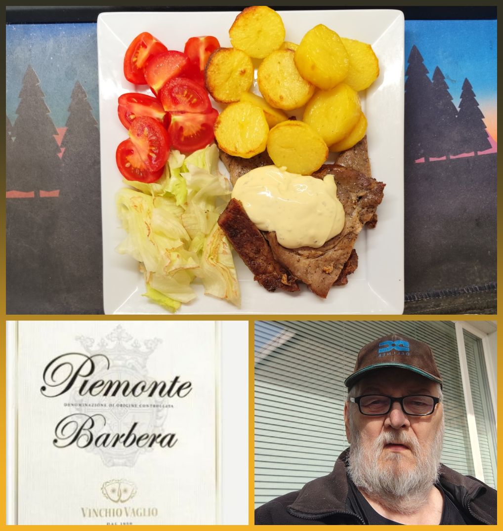 På tallriken har jag lite Carré som blev över från igår,lite ugnsrostad potatis och grönt,toppade med lite bea,,i glaset samma röda Italienare som igår..Blev en stund på balkongen på eftermiddagen,riktigt skönt i solen..