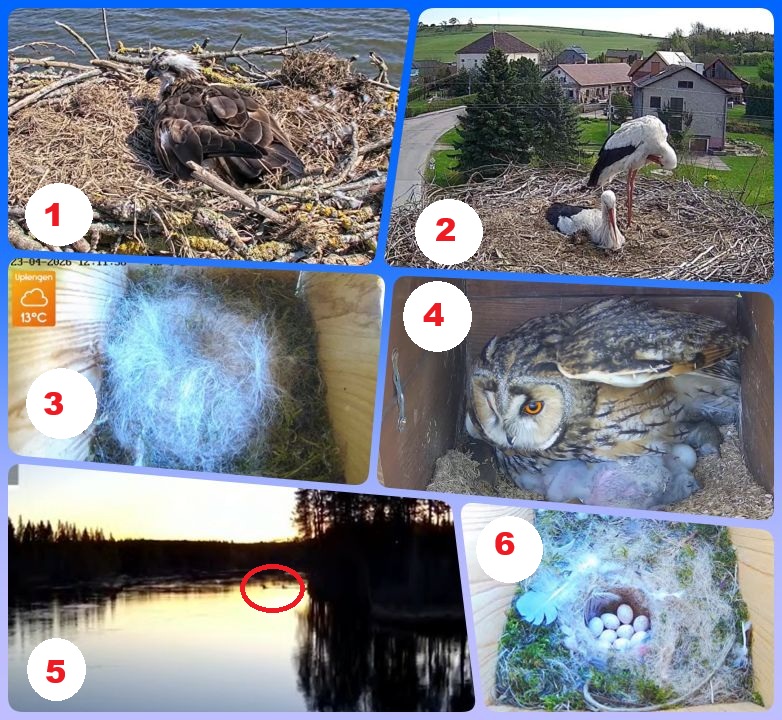 Tar och kollar läget inför Naturruta 2..Har det hänt något sedan senaste kollen.Startar hos<1>Fiskgjusarna där ligger Maya på de 4 äggen..<2> storkarna i Tjeckien Mamma Stork sköter äggen Pappa Stork putsar kostymen..<3> Talgoxen LaLi döljer de 4 äggen när hon lämnar holken..<4>Hornugglan har ett sjå med matning av sina 5 hungriga ungar,pappa Uggla kommer nattetid med påfyllning av matförrådet..<5>Här ser vi älgarna 5 och 6 simma över Ångermanälven kl är 04:07..<6> Blåmesen Bluna har lämnat sina 10 ägg för en kort stund..Forts:följer..