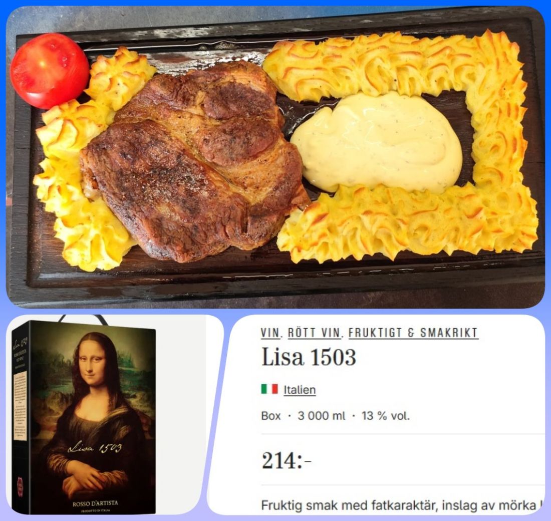 Det blev en planka idag,en förstekt Carré bit,potatismos ägg tomat och Bea..15 min i ugnen som var på 200*..I glaset samma goda röda från Italien ”Lisa”