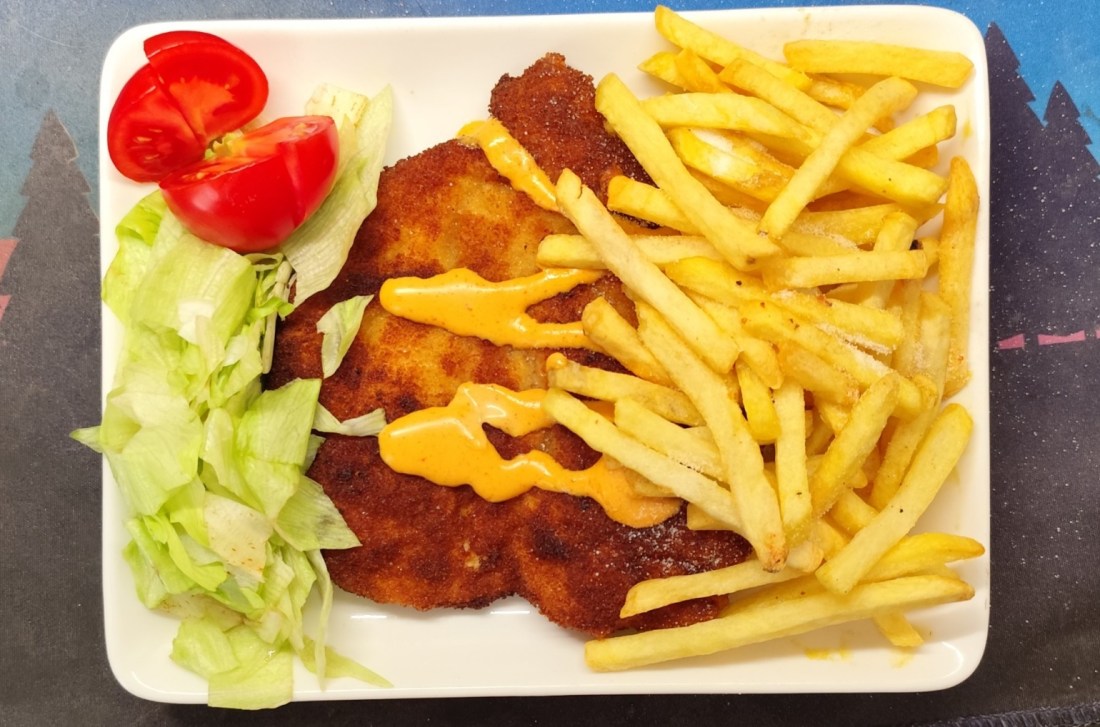 Idag blev det Kycklingbröstfié,jag delade den inte helt igenom,bankade ut den och panerade,stekte den sedan ca 3 min på båda sidor.Hade pommesstrips i airfryern,fixade lite grönt på tallriken,fyllde ett glas med den röda Lisa från Italien.Lite Hot Kebabsås såg till att det blev lite drag i rätten..Riktigt Gott.