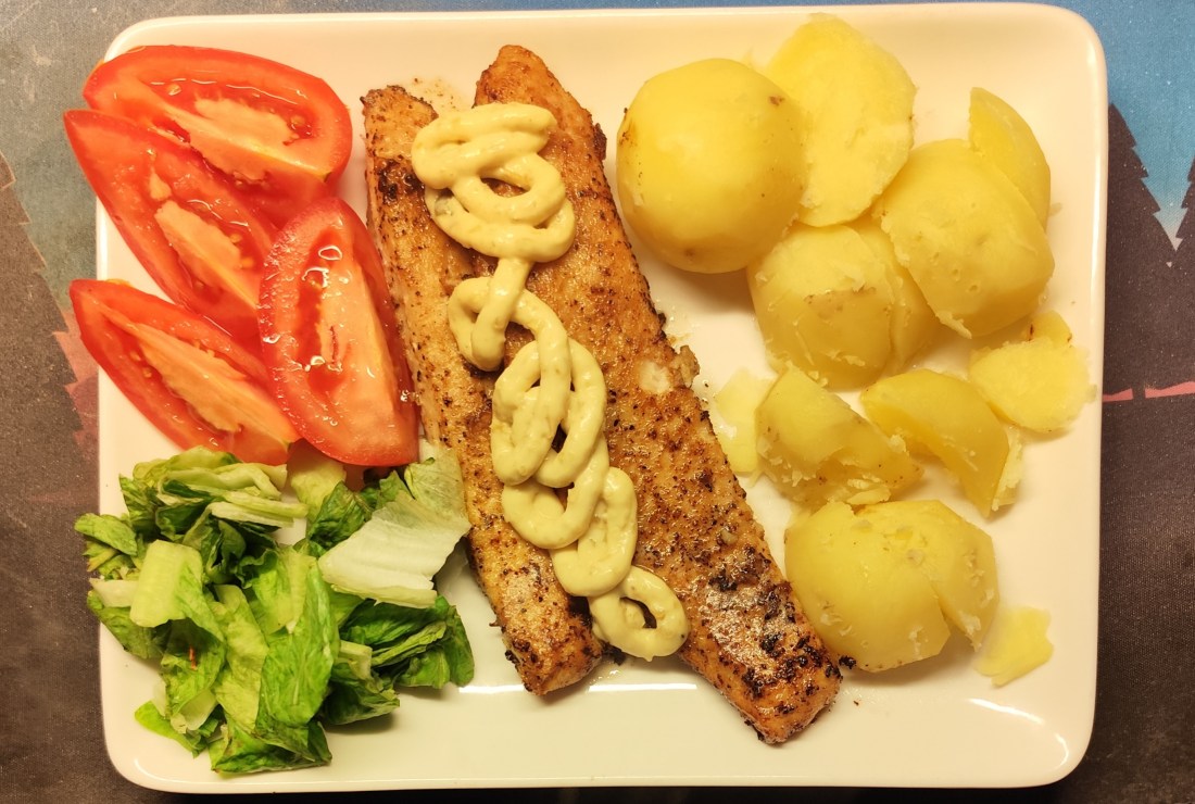 Ja vad blev det.Jo Hajmal…Hajmal är den svenska handelsbenämningen och samlingsbeteckning på fyra arter av sötvattenslevande malartade fiskar Hajmal importeras till Sverige från Vietnam, där den odlas i Mekongfloden. Fisken smakar riktigt bra kryddad med salt,vitpeppar och citronpeppar.På tallriken blev det kokt potatis remouladsås tomat och lite romansallad.I glaset friskt kranvatten..Smakade riktigt bra..
