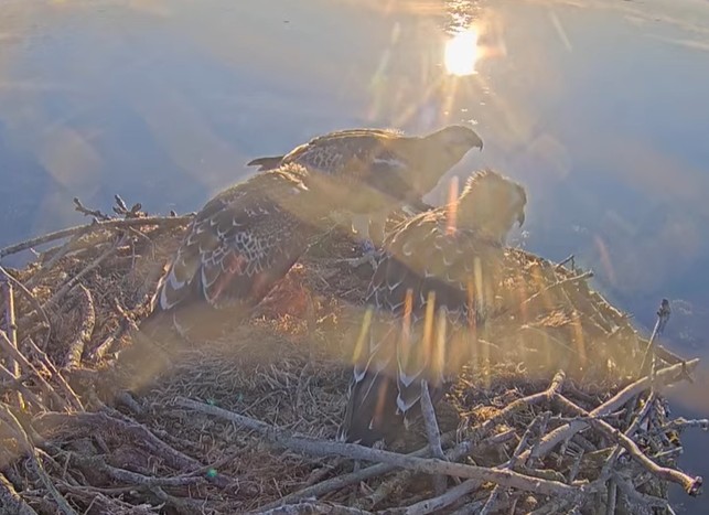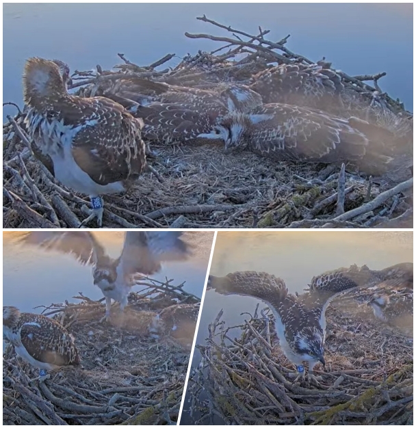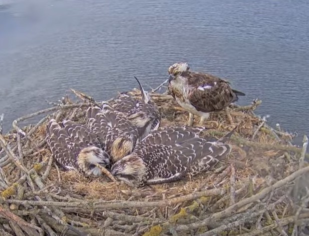 Fiskgjusarna i England 3 av ungarna tar en liten rast i boet,medan solen sprider sitt guldglimmande sken..kl är 07:05