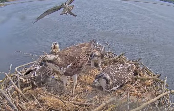 Kl 10:45 kommer mamma Maya inflygande till boet med dagens lunch i klorna. Alla 4 ungarna är samlade i boet.