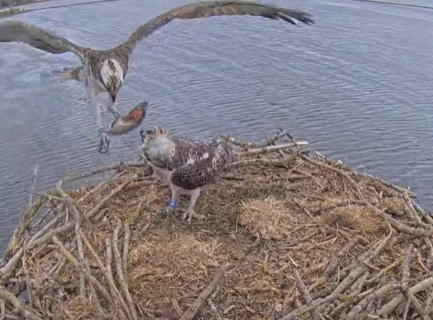 Den ena ungen blev inte många minuter i boet,mamma Maya kom med en fisk i klorna,som hon delade med sin unge.