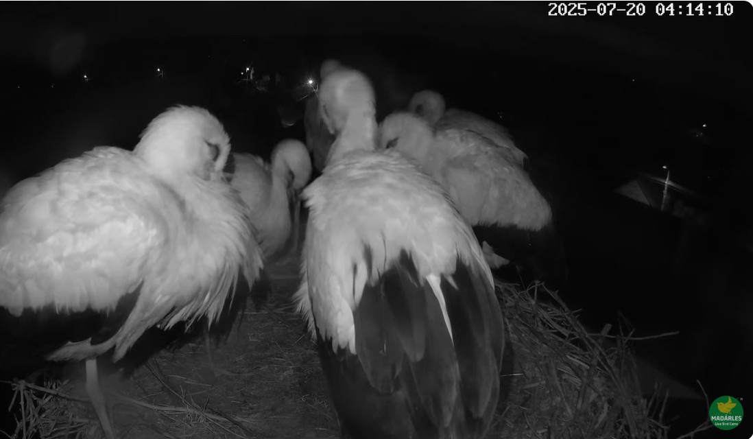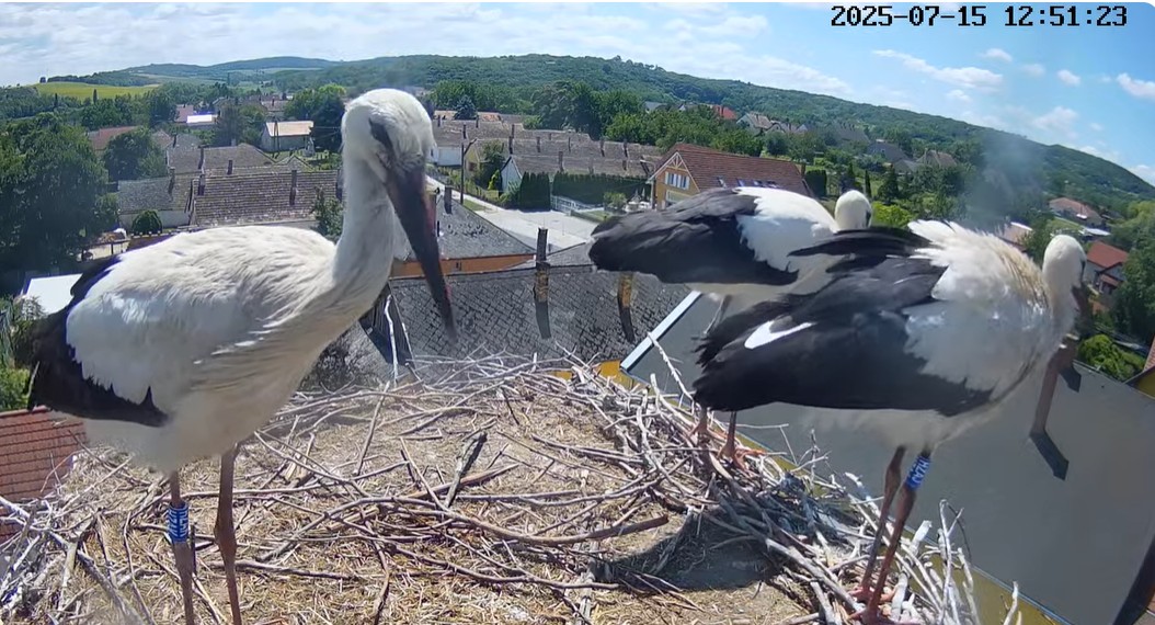 Familjen Stork i Ungern kl är nu 05:10 och alla 4 ungarna är uppe på benen efter att ha tillbringat natten här i boet.