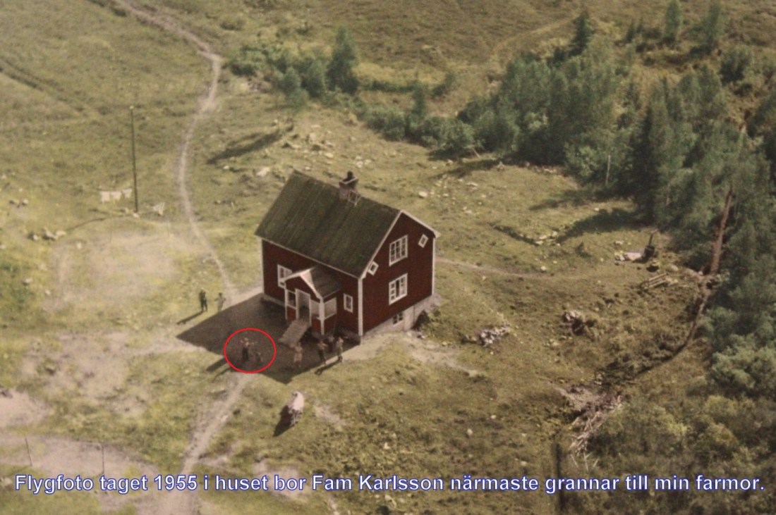 Jag har en bild i mitt bildarkiv,ett flygfoto där man ser min farmors hus man ser även två av mina farbröder som slår höet på lägdan intill huset,farbröderna är Elias i nederkant och Einar som vinkar till piloten.I övre högra hörnet ser man ett hus närmaste granne till farmor,där bodde fam Elof Karlsson.En av sönerna Karlsson lade nyss ut en bild,ett flygfoto från 1955,han hade lagt till info om bilden..Och gissa en som blev överraskad,mitt minne skuttade genast 65 år tillbaka,till 1955.Tack Knut Lennart för bilden.