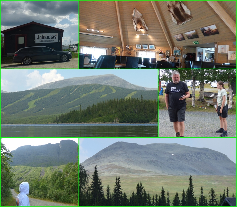 Onsdagens utflykt blev ju ett besök i Vilhelmina och nästa tripp blev Borgafjäll (sydsamiska Båargese),på torsdagen,ca 7 mil mot nordväst..Ett besök till Borgahällan Den kännetecknas av den väldiga klippväggen som är ca 700 m hög..Vi käkade lunch på Johannas i den jättelika Kåtan..Jättefin miljö,men maten är inget man behöver skriva hem om..När vi körde hem till stugan hamnade vi ett våldsamt regnväder,häftigt men varade inte länge.Tömde regnmätaren vid stugan,bara 11 mm,så det mesta av regnet gick nog förbi.
